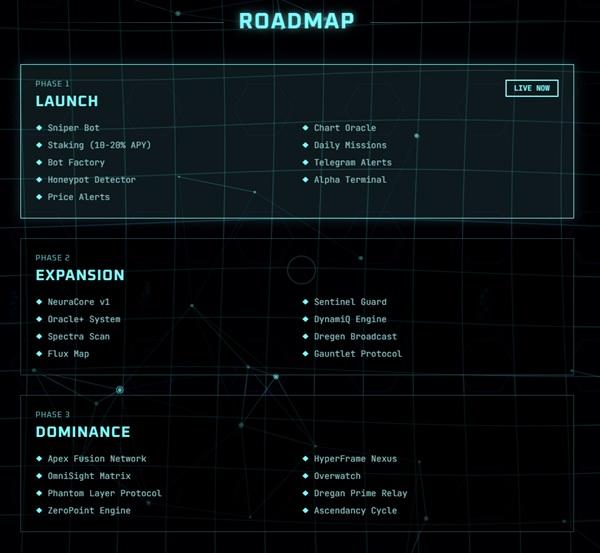 Dregan AI follows a three-phase roadmap designed to scale the project from core trading tools into a fully autonomous AI network.